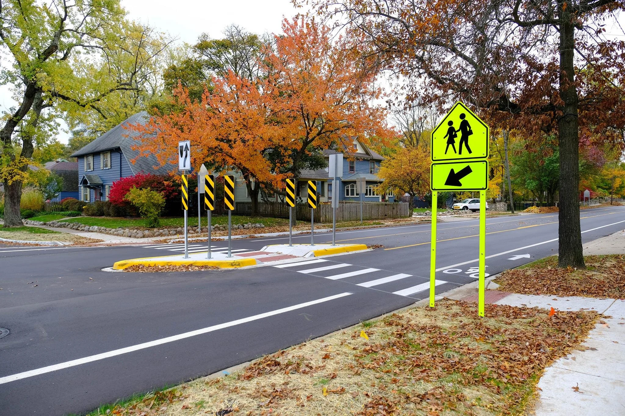 Improved pedestrian features, including a pedestrian island at Maple Street and a new crosswalk at Chevy Chase
