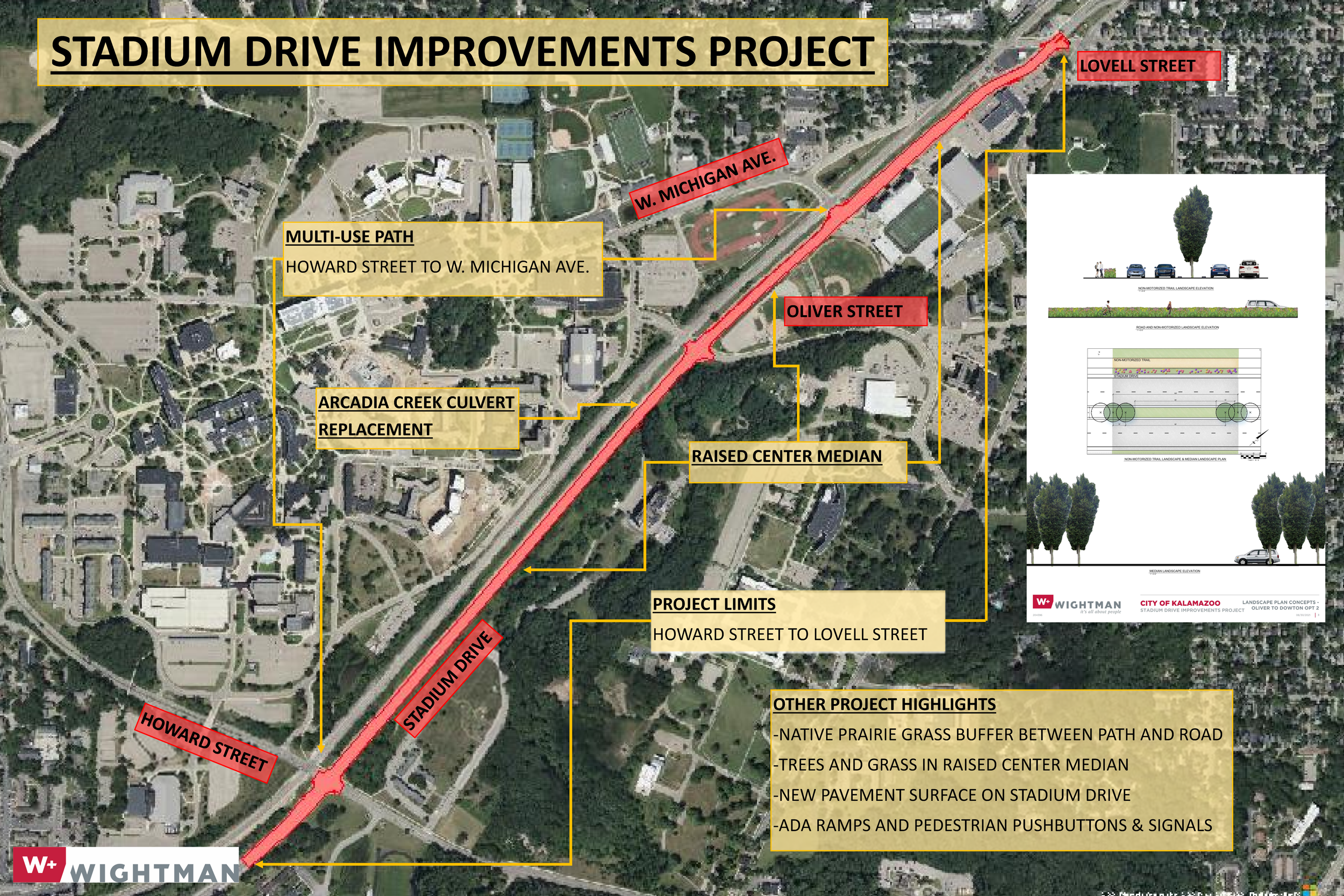 Stadium Drive was one of several streets transferred from MDOT to local control in 2019 (other major streets include Westnedge and Park). This year, it will become the first of these streets to be rebuilt for the needs of our community. Work to replace an aging culvert at Arcadia Creek is currently underway, which will pave the way for reconstruction of the street from Howard to Lovell starting on April 4th, 2022. It is scheduled to be completed in October.